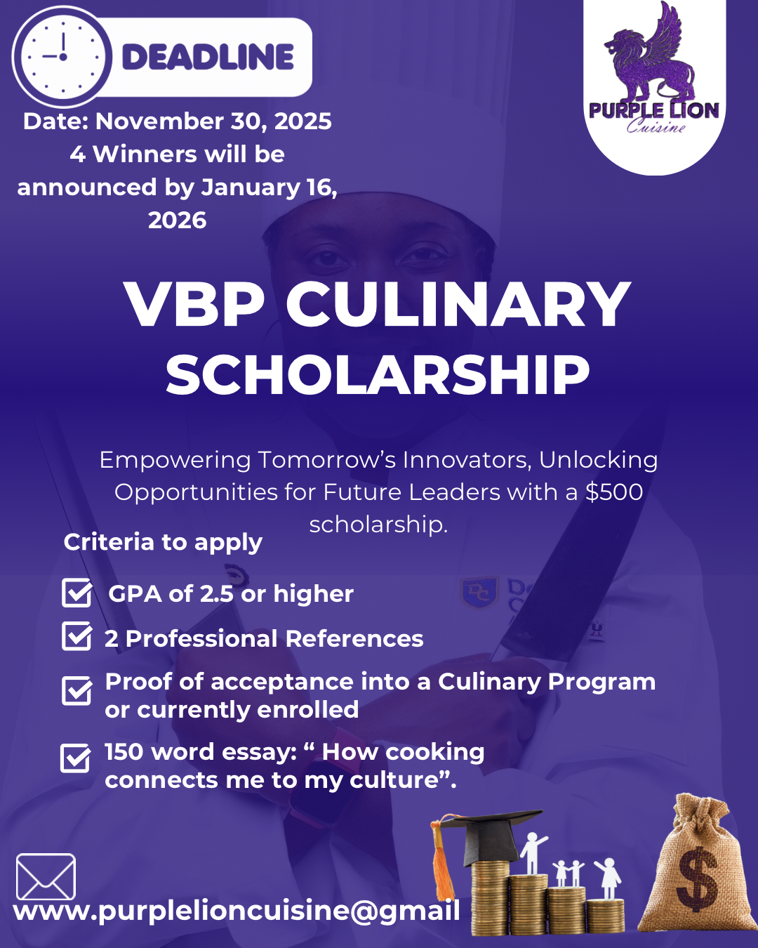 The VBP Culinary Scholarship is named in honor of my late beloved mother, Velma Bridges-Porter, a passionate educator who believed in empowering scholars with opportunities to excel through education.